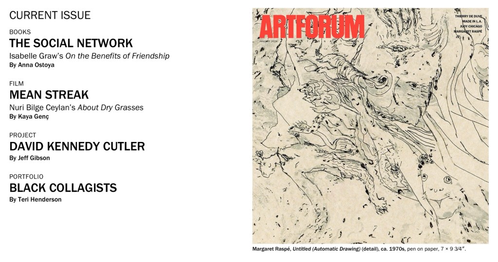 December 1, 2024 – For the first time, Artforum’s annual Year-in-Review issue includes “The Critics’ Critics.” Thrilled to be part of this, published in the December 2024 issue, alongside some of my favorite art critics writing today. Also in the December 2024 issue, I review Itziar Barrio’s latest show.