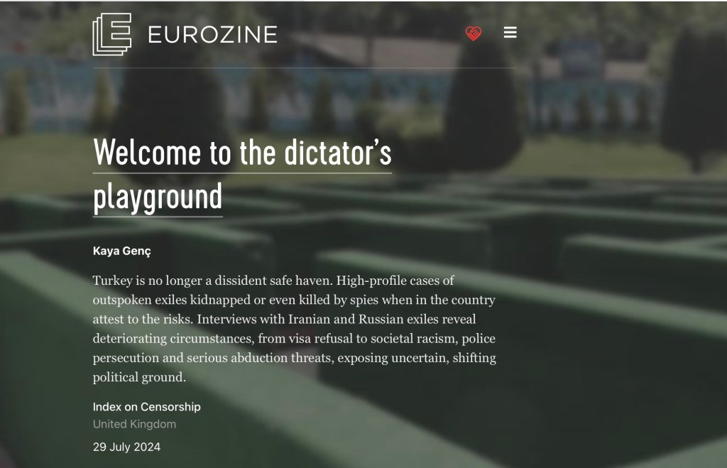 July 31, 2024 – Eurozine magazine leads with my investigation into the living conditions of foreign dissidents based in Turkey.