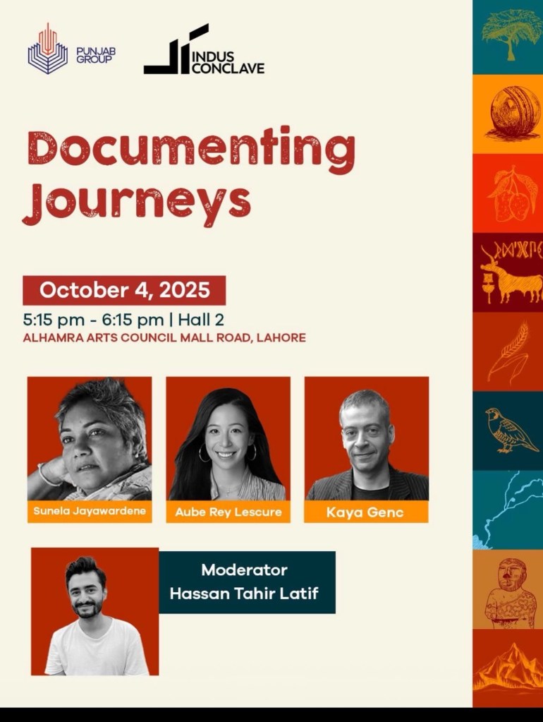 October 4, 2025 – A conversation on documenting journeys with Aube Rey Lescure, Sunela Jayawardene and Hassan Tahir Latif at Indus Conclave festival in Lahore.