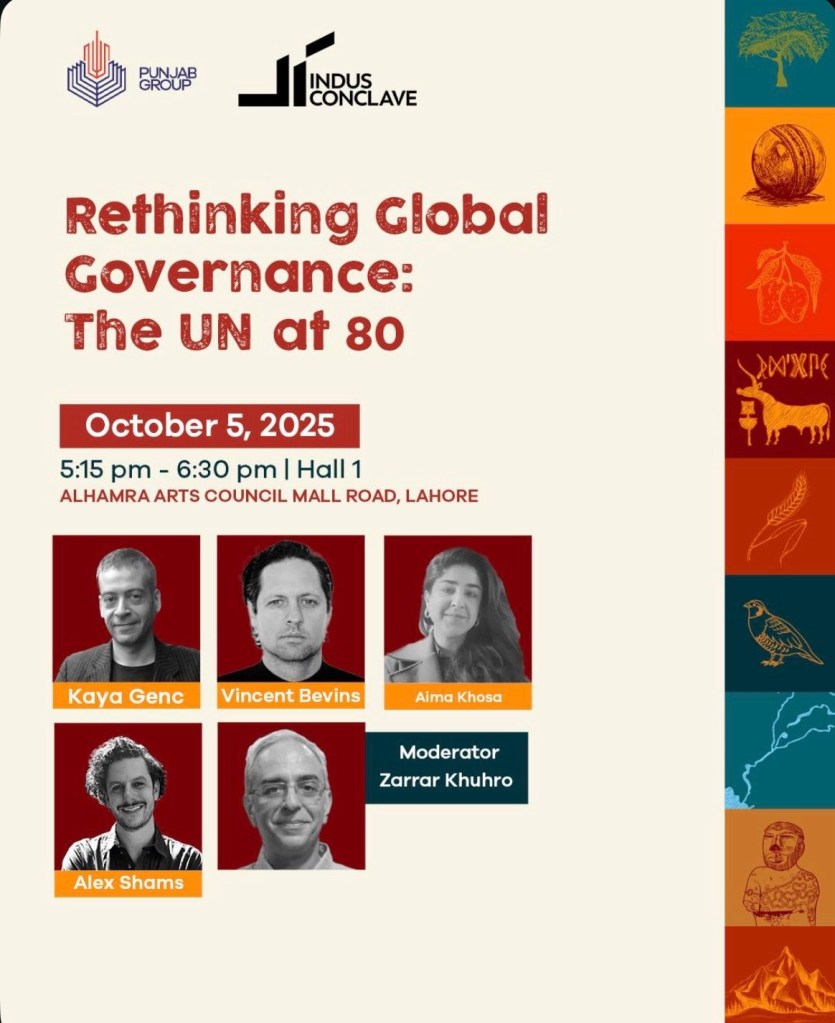 October 5, 2025 – A conversation on rethinking global governance with Alex Shams, Aima Khosa and Zarrar Khuhro at Indus Conclave festival in Lahore.