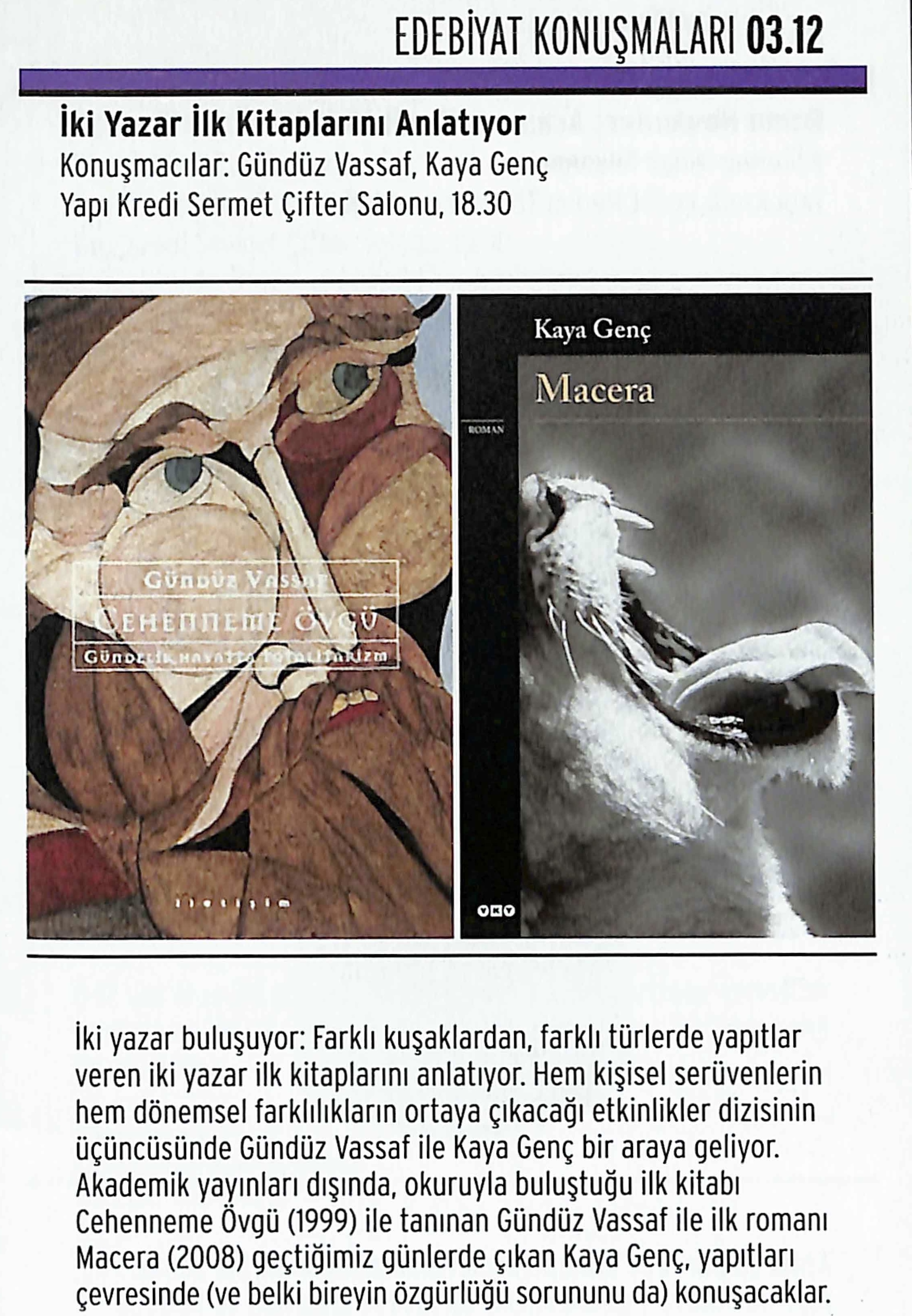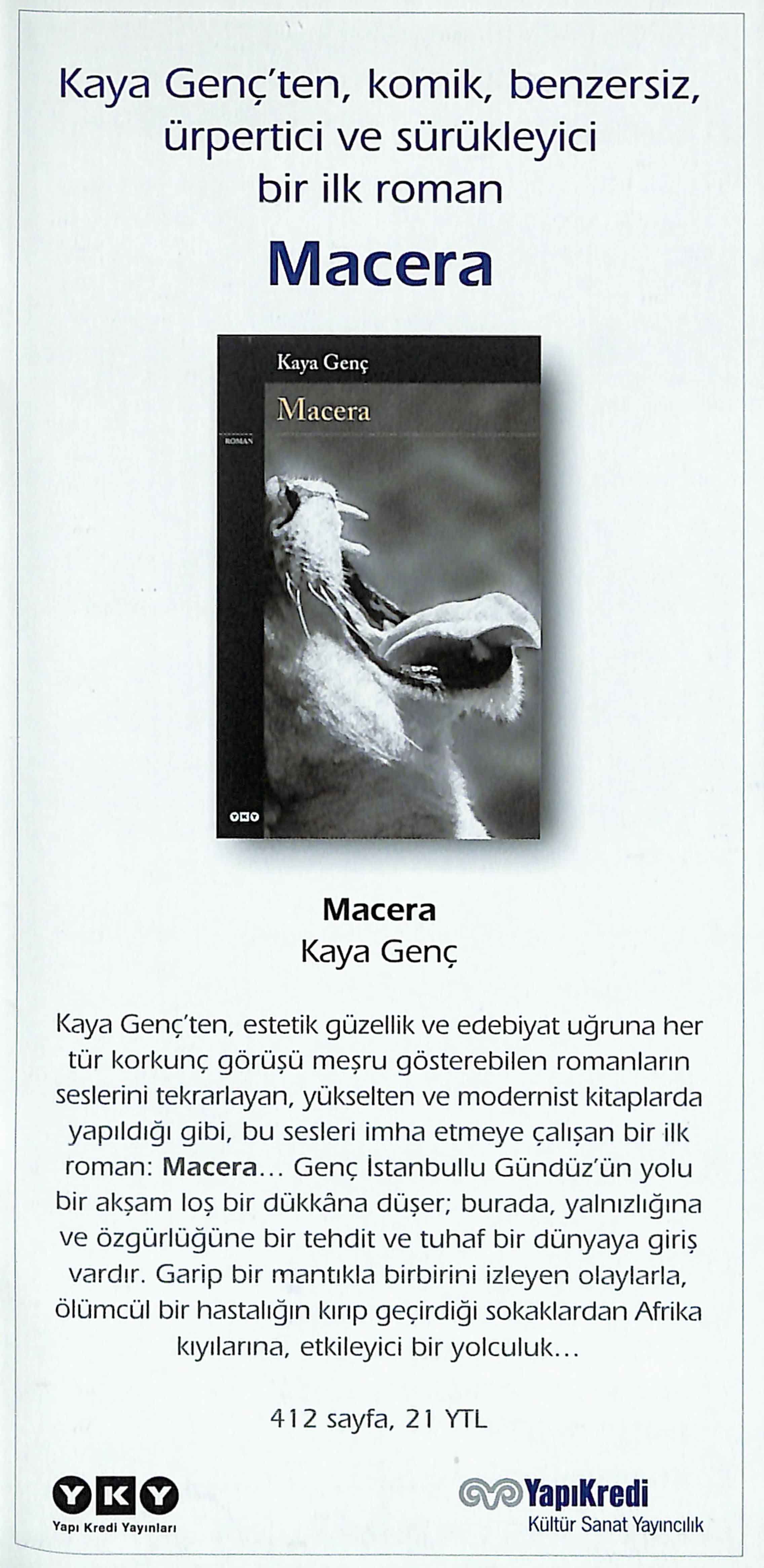 ‘Kaya Genç’in ilk romanı Macera. Fantastik bir serüven vaat ediyor okuruna hem de olgun bir yazar üslubuyla’—İhsan Yılmaz, Hürriyet